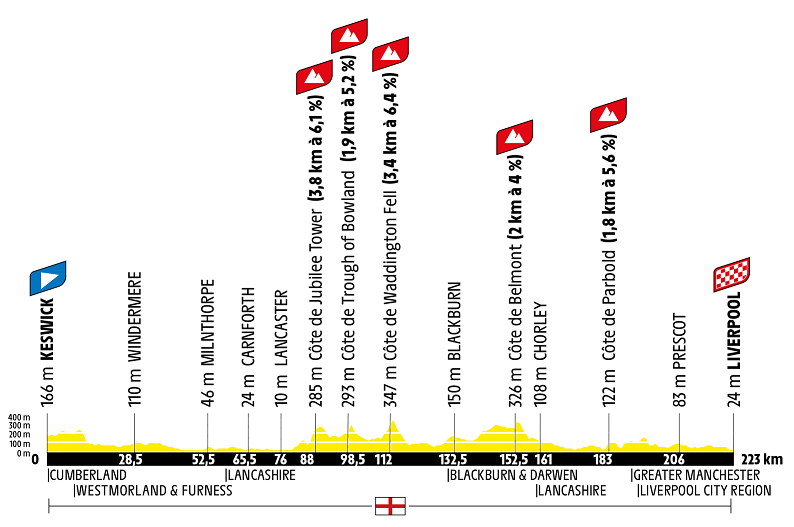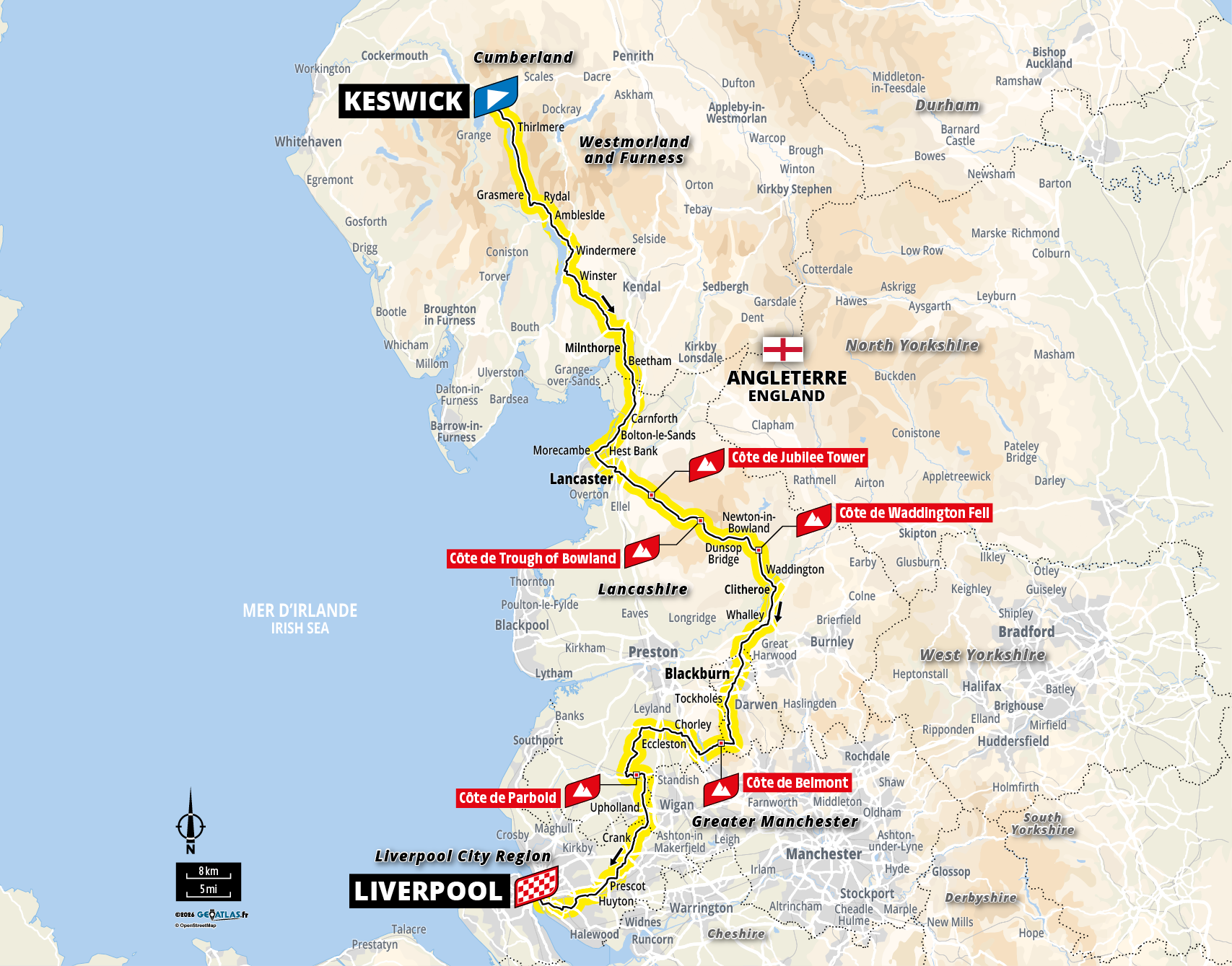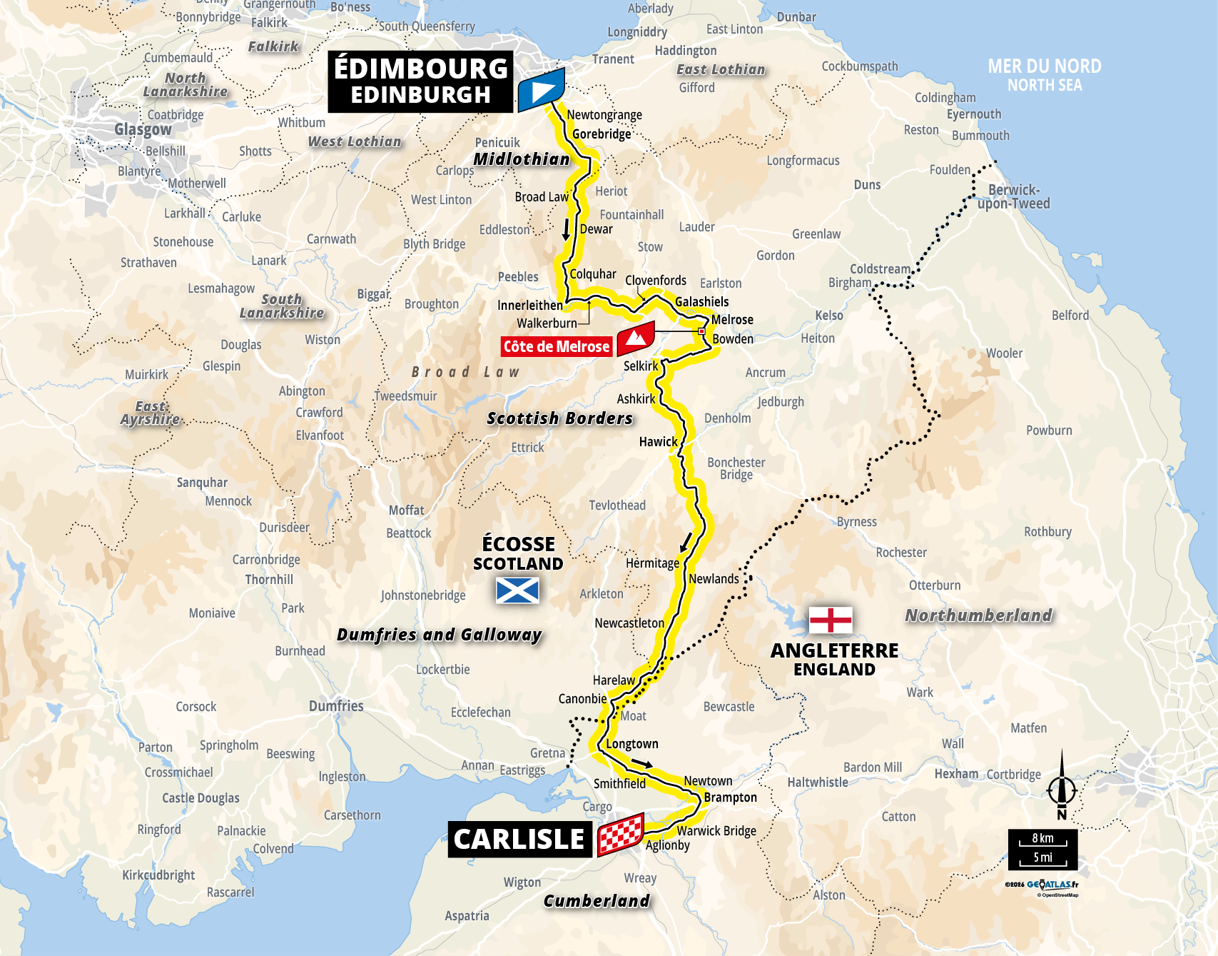 Ces 3 étapes relieront les capitales écossaise, Edimbourg et galloise, Cardiff en traversant l'Angleterre, le peloton visitant ainsi la Grande-Bretagne du nord au sud.