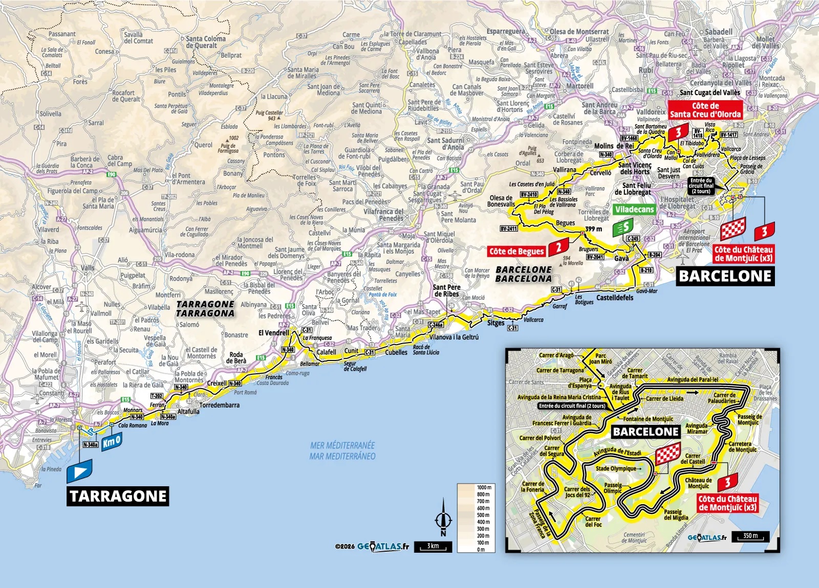 Etape 2 Tarragone A.S.O. © A.S.O. / 2026 Geoatlas.fr Etape 3 Granollers 196 km Etape 4 Carcassonne - Foix 182 km A.S.O. Etape 5 Lannemezan - Pau 158 km Etape 6 Pau - Gavarnie-Gèdre 186 km A.S.O.